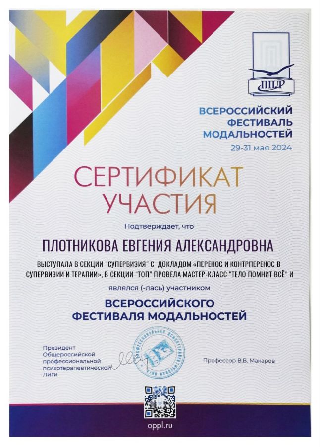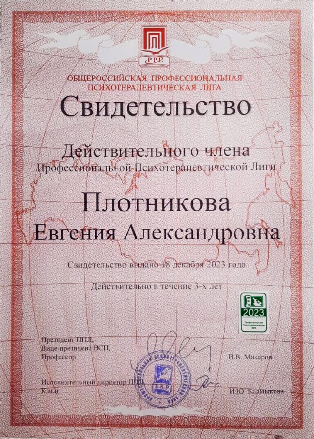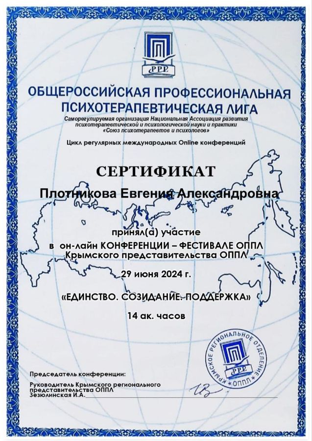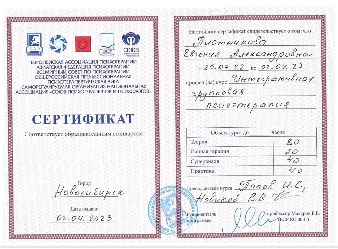 По завершении работы в группе вы можете получить накопительный сертификат от ОППЛ . Сертификат ОППЛ признаны в профессиональном сообществе и помогут укрепить вашу репутацию и подтвердить вашу компетентность в психологической сфере.