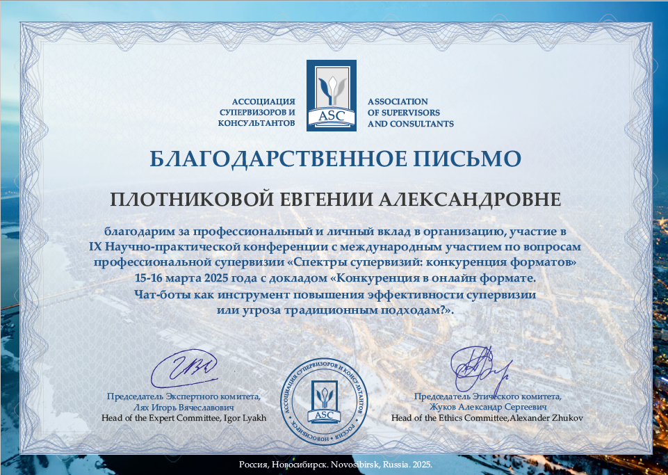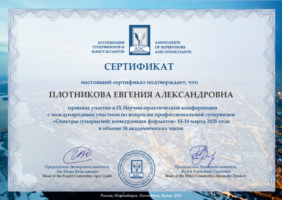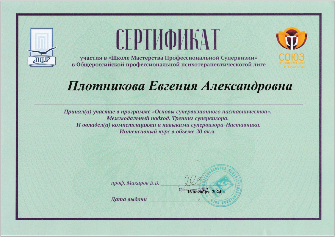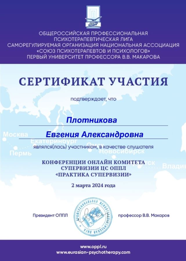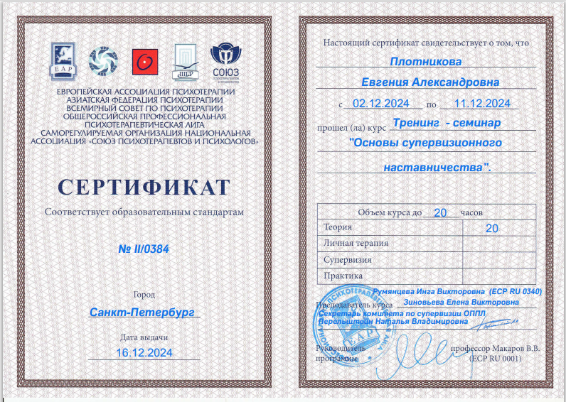 После посещения 40 часов супервизии Вы можете получить накопительный сертификат от ОППЛ. Сертификат ОППЛ признаны в профессиональном сообществе и помогут укрепить вашу репутацию и подтвердить вашу компетентность в психологической сфере.